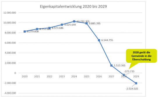 Die Allgemeine Rücklage ist in der mittelfristigen Planung bis 2029 nicht mehr ausreichend; ab 2028 entsteht rechnerisch ein „nicht durch Eigenkapital gedeckter Fehlbetrag“ – die Überschuldung der Gemeinde tritt ein. Dies bedeutet nicht nur weniger finanziellen Spielraum, mehr Konsolidierungsdruck und eine stärkere Bindung an Vorgaben der Kommunalaufsicht. Die Aufsichtsbehörde kann in einem solchen Fall Anordnungen treffen und notfalls weitergehende Schritte ergreifen, um eine geordnete Haushaltswirtschaft wiederherzustellen. Wir verlieren also die eigenen Gestaltungsmöglichkeiten.