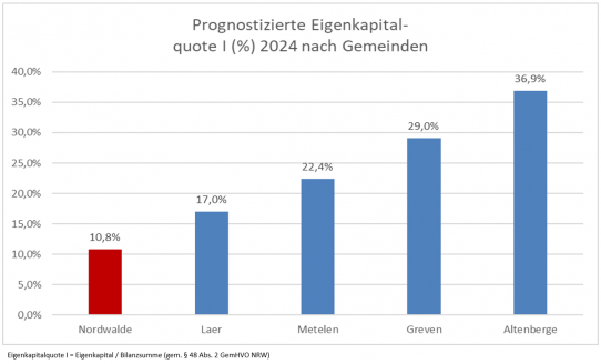 In Bezug auf das Gemeindevermögen sieht die Situation nicht besser aus. Die Eigenkapitalquote I lag zum 31.12.2024 bei 10,8%. Auch hier steht Nordwalde im interkommunalen Vergleich am schlechtesten da. Und die Tendenz für die Entwicklung des Eigenkapitals ist sehr negativ. Der fiktive Haushaltsausgleich wird 2025 und 2026 noch über die Ausgleichsrücklage hergestellt. Für den prognostizierten Fehlbetrag in 2027 von ca. 5,0 Mio. Euro reicht die Ausgleichsrücklage dann bei Weitem nicht mehr aus – es muss auf die allgemeine Rücklage, also das Tafelsilber der Gemeinde, zurückgegriffen werden – was der Genehmigung durch die Aufsichtsbehörde bedarf.