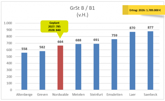 Bleibt noch die Gewerbesteuer, die für unsere Gemeinde die größte selbst zu beeinflussende Ertragsquelle ist – mit ca. 5 Millionen Euro im Jahr 2026. Hierzu sind zwei Dinge festzuhalten: Zum einen ist die Gewerbesteuer stark abhängig von der allgemeinen wirtschaftlichen Lage. Zum anderen steht Nordwalde bei den Gewerbesteuern – wie bereits betont – mit den anderen Kommunen in einem direkten Wettbewerb. Die geplante Erhöhung auf 450 v.H. wird Nordwalde bereits in die Spitzengruppe unter den Nachbargemeinden bringen. Alles natürlich unter der Voraussetzung, dass die anderen Gemeinden ihre Steuersätze nicht auch erhöhen, was wegen der allgemein schlechten Finanzlage möglich erscheint.