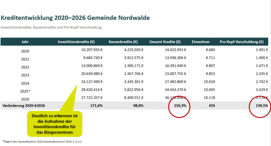 unächst aber lohnt ein Blick auf die Kreditentwicklung von Nordwalde. Hier fällt auf, dass die Investitionskredite – maßgeblich durch den Bau des Bürgerzentrums – zwischen 2021 und 2025 von 9,6 Mio. auf 28,6 Mio. Euro angestiegen sind. Das ist eine Zunahme von 195 %, also annähernd eine Verdreifachung! In der Folge ist auch die Pro-Kopf-Verschuldung in diesem Zeitraum von 1.400 € auf knapp 3.600 € pro Einwohner gestiegen. Diese Verhältniskennzahl lässt einen Vergleich mit unseren Nachbarkommunen zu. Und hier fällt auf, dass Nordwalde bereits im Jahr 2025 den unrühmlichen Spitzenplatz eingenommen hatte.